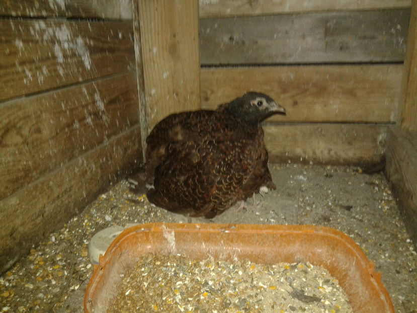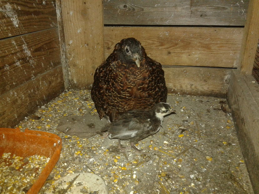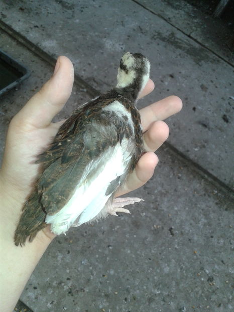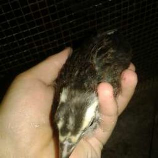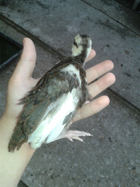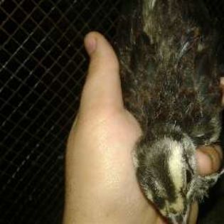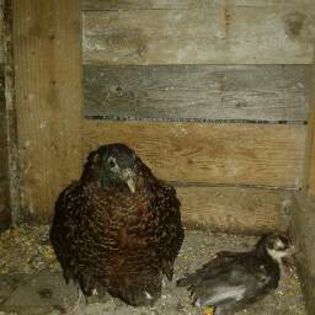 avand o rana mare pe cap , a fost separata de celelalte , impreuna cu un mascul tanar , aceasta a mai depus 7 oua , intr-un cuib de porumbel si acum le closeste Au ramas 3 puisori frumosi si sanatosi din cei 5 iesiti! Cei 3 pui sunt 1 mascul si 2 femele.